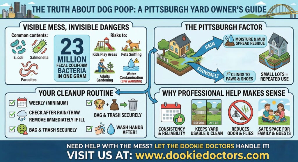 Pittsburgh yards often deal with rain, thawing snow, shaded ground, and muddy patches that do not dry quickly. In those conditions, waste does not simply stay where it lands.